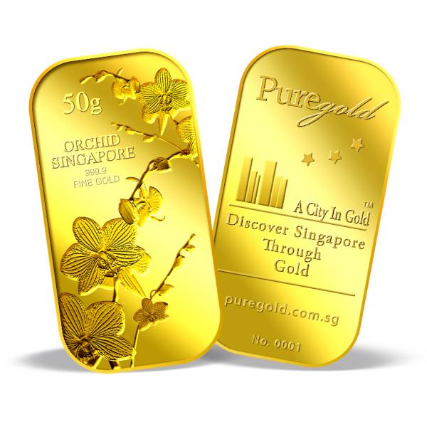 50g gold bar embossed with the image of Singapore national flower, the Vanda (Miss Joaquim).