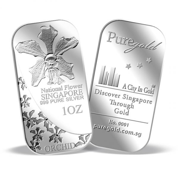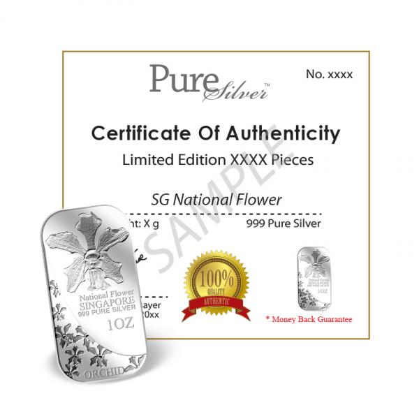 The images of hybrid orchid are embossed on a 1Oz 999 fine silver bar.