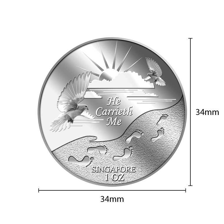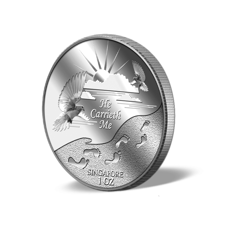 The He Carrieth Me silver medallion design portrays a beautiful image of the sun rising from behind the clouds, two doves, and a set of footprints. The design also includes the inscription HE CARRIETH ME, SINGAPORE, the medallion’s weight and GoldSilver Refinery’s “GS” logo mark.