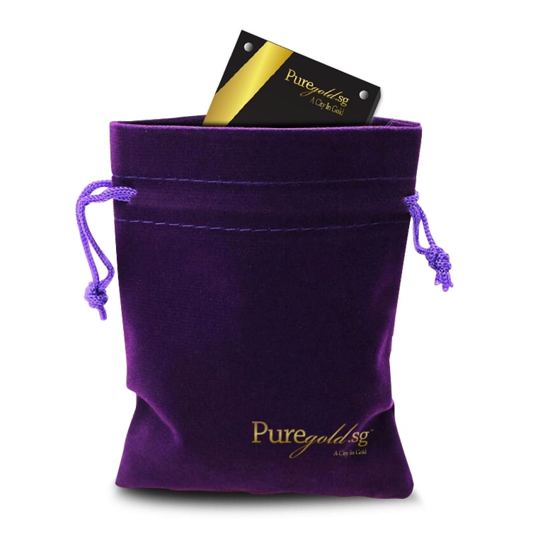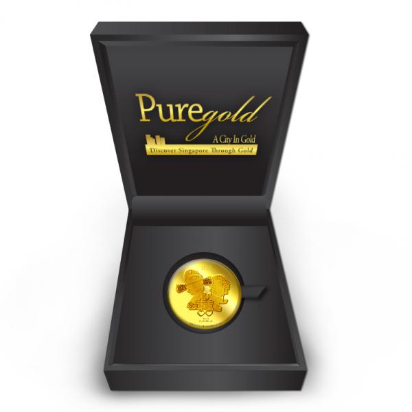 The Double Happiness gold Medallion design portrays a beautiful image a groom and a bride in traditional Chinese wedding costumes, behind the Chinese ligature of “Double Happiness”. The design also includes the inscription PRODUCT OF PUREGOLD.SG, as well as the Medallion’s weight and fineness.