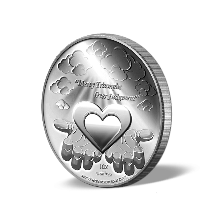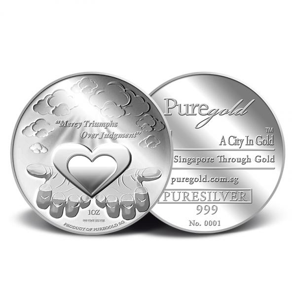 The Mercy Triumphs Over Judgment silver medallion design portrays a beautiful image of a pair of hands holding a heart reaching out from the clouds. The design also includes the inscription “Mercy Triumphs Over Judgment”, PRODUCT OF PUREGOLD.SG and the medallion’s weight and fineness.