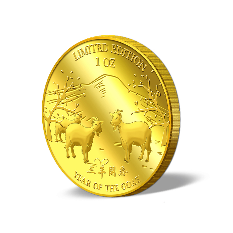 The 1oz Year of the Goat gold Medallion design portrays an image of three goats on a pasture, against the backdrop of trees and a mountain. The design also includes the inscription LIMITED EDITION, YEAR OF THE GOAT, 三羊開泰and the Medallion’s weight.
