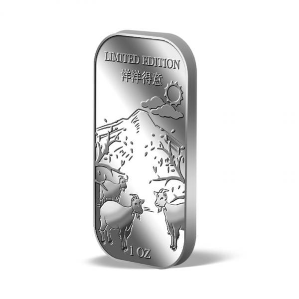 The 1Oz Year of the Goat silver bar design portrays an image of three goats on a pasture, against the backdrop of trees, a mountain, clouds and the sun. The design also includes the inscription LIMITED EDITION, 洋洋得意and the bar’s weight.