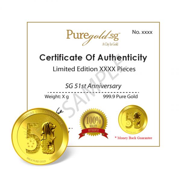 This year marks the 51st year of Singapore's birthday and its independence. The design on this Medallion are iconic to Singapore and aims to commemorate Singapore's 51st Anniversary, starting with the mythical Merlion, followed by the finish on the number 5, which resembles the Esplanade, widely known by Singaporeans as the durian building. The 5 stars located within the number 5 are the stars that are presented on our national flag. Do not miss this unique Medallion that can only be found in our store!