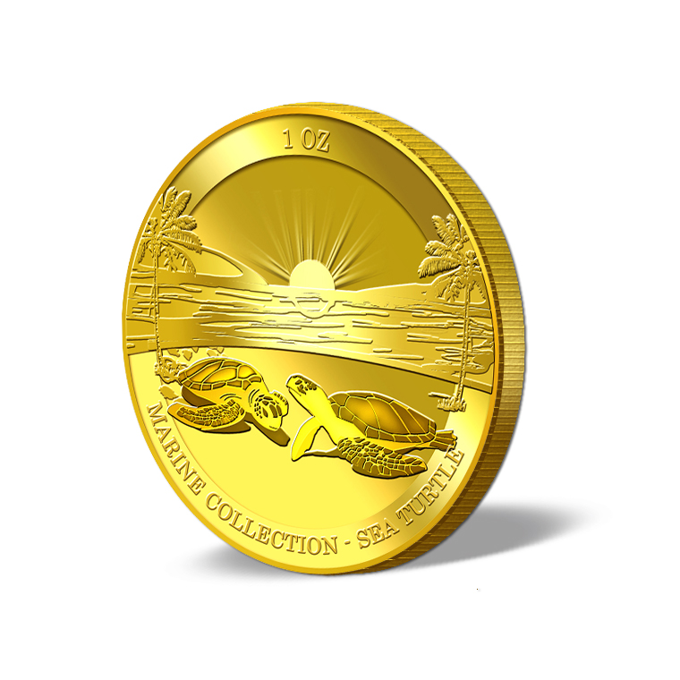 The image of the two sea turtles is embossed on a 1oz 999.9 fine gold.