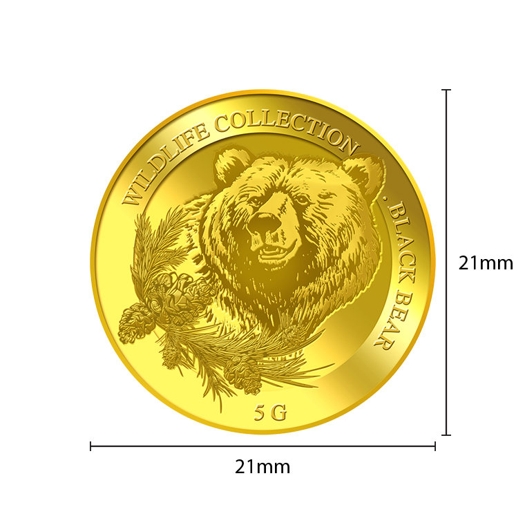 Iconic Reverse DesignThe 5g black bear gold Medallion design portrays an image of an emerging black bear. The design also includes the inscription WILDLIFE COLLECTION, the Medallion’s weight and fineness, and GoldSilver Refinery’s “GS” logo mark.
