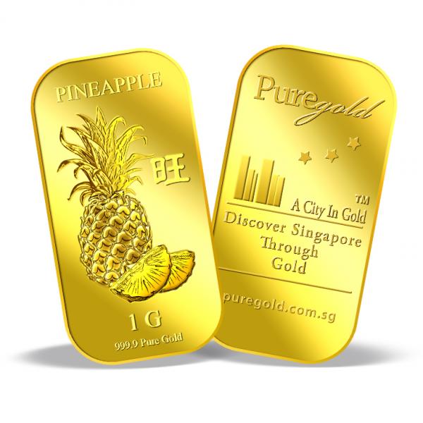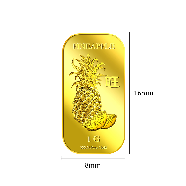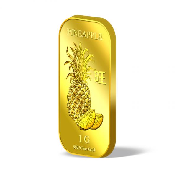 The image of the pineapple is embossed on a 1g 999.9 fine gold bar.