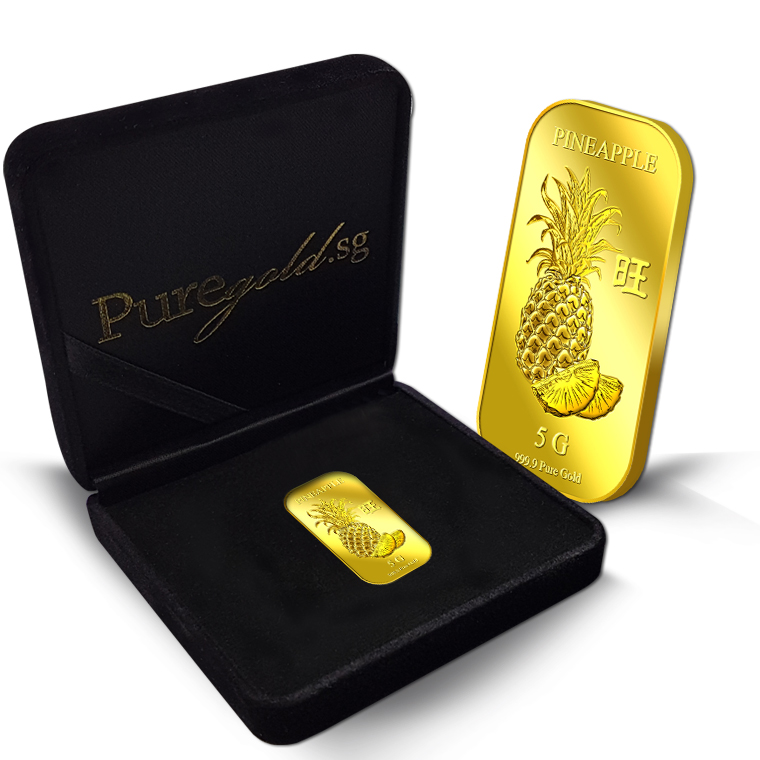 The image of the pineapple is embossed on a 5g 999.9 fine gold bar.