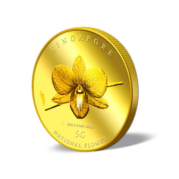 The image of Singapore’s national flower, Vanda Miss Joaquim Orchid, is embossed on a 5G 999.9 fine gold Medallion.