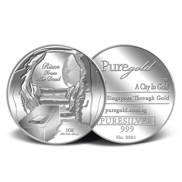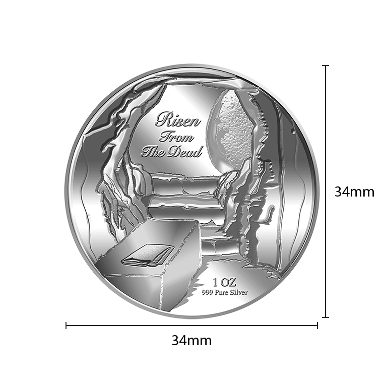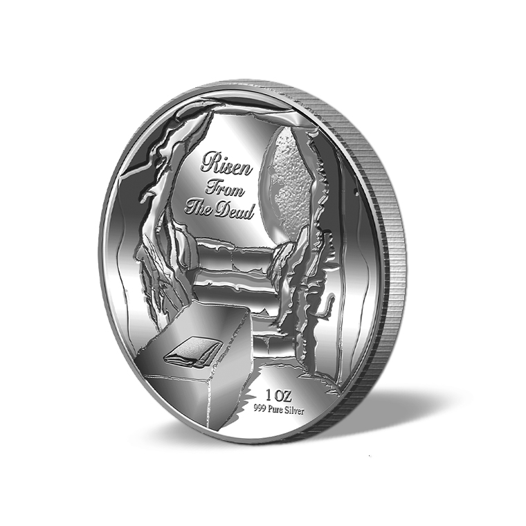 The images of Risen from the Dead are embossed on a 1Oz 999 fine silver medallion.