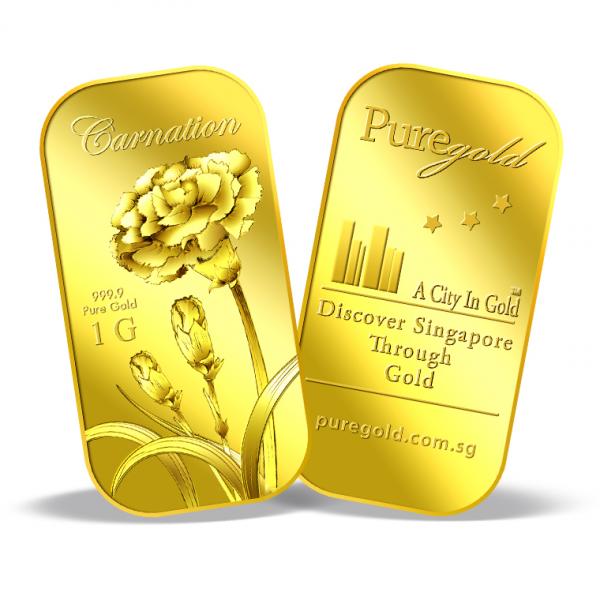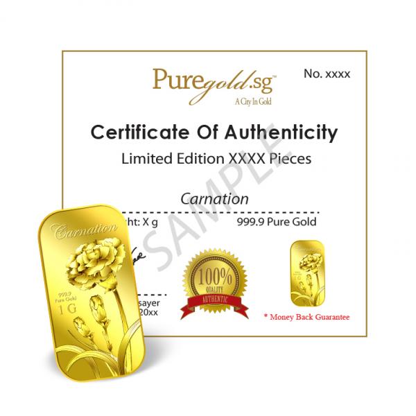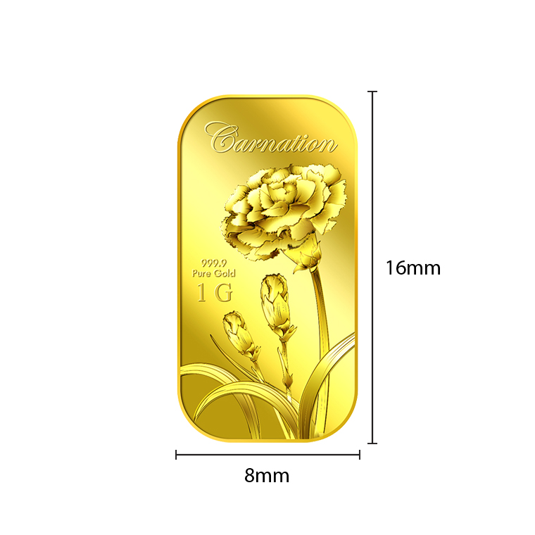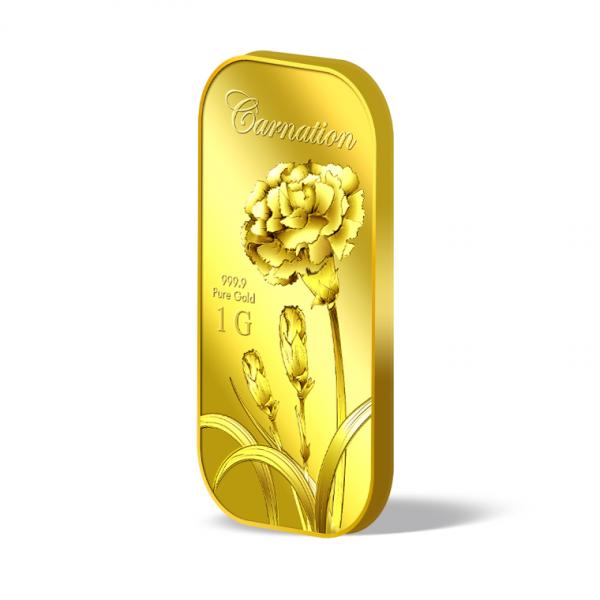 The image of the Carnation is embossed on a 1g 999.9 fine gold bar.