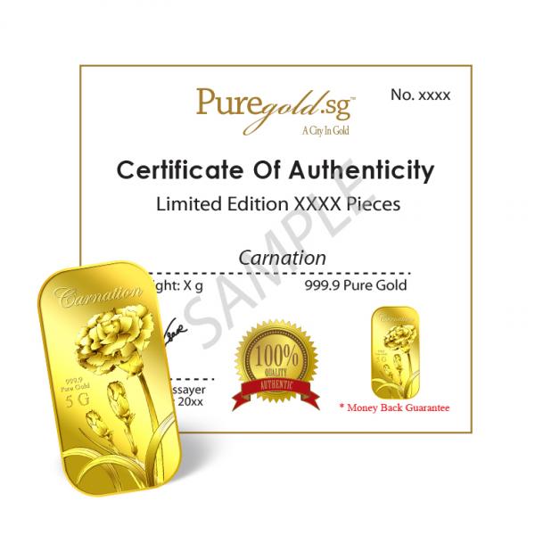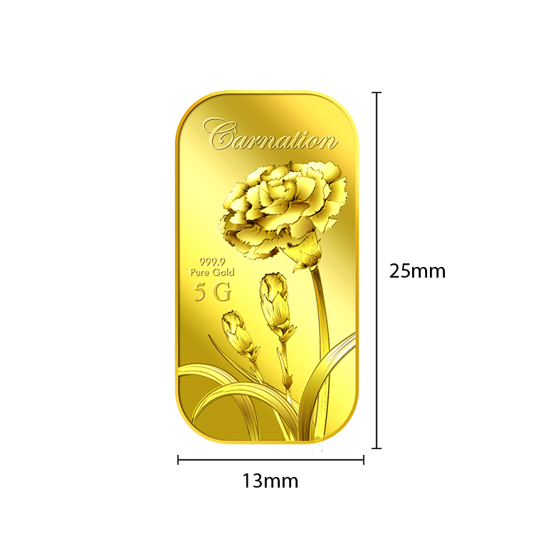 The image of the Carnation is embossed on a 5g 999.9 fine gold bar.