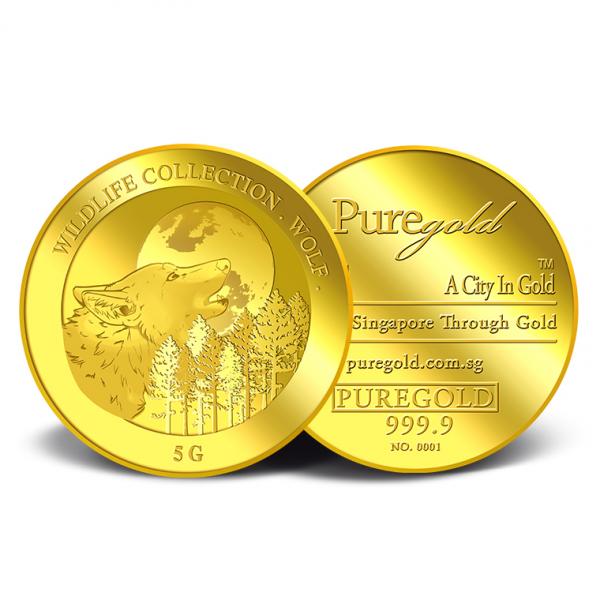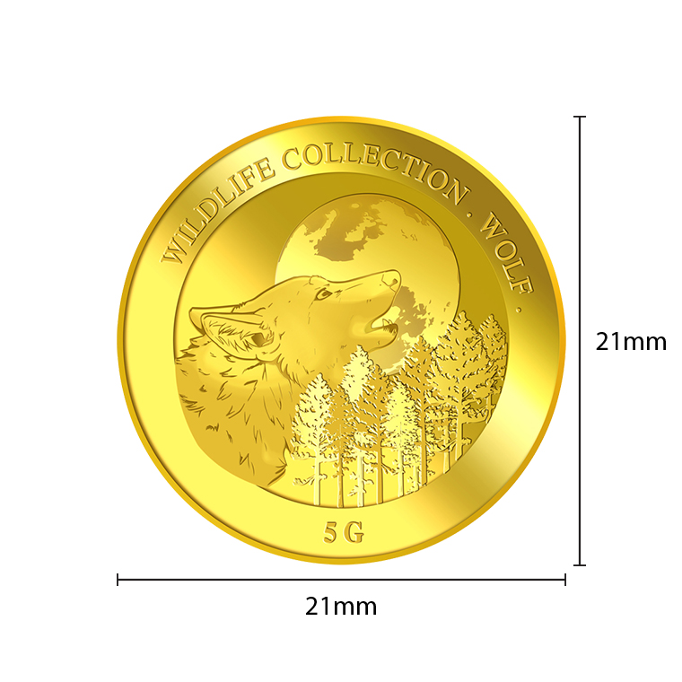 The image of a Wolf is embossed on a 5g 999.9 fine gold.