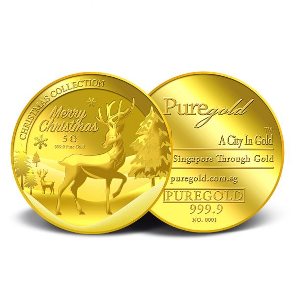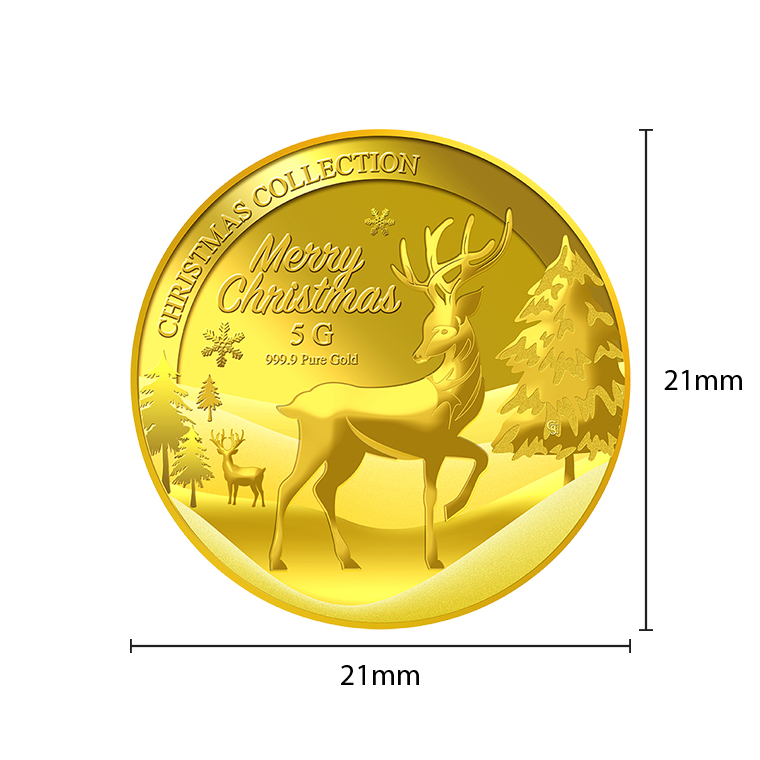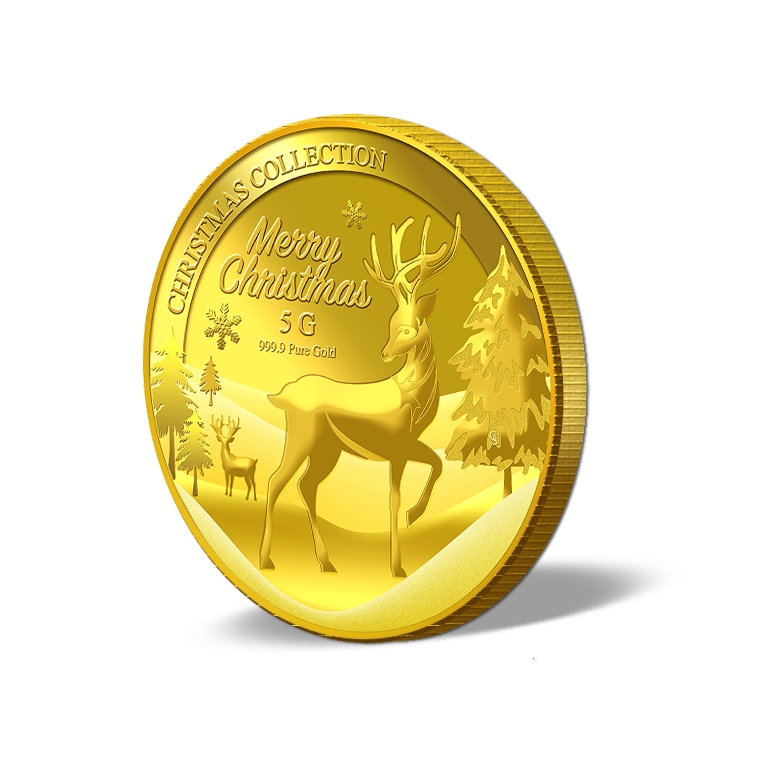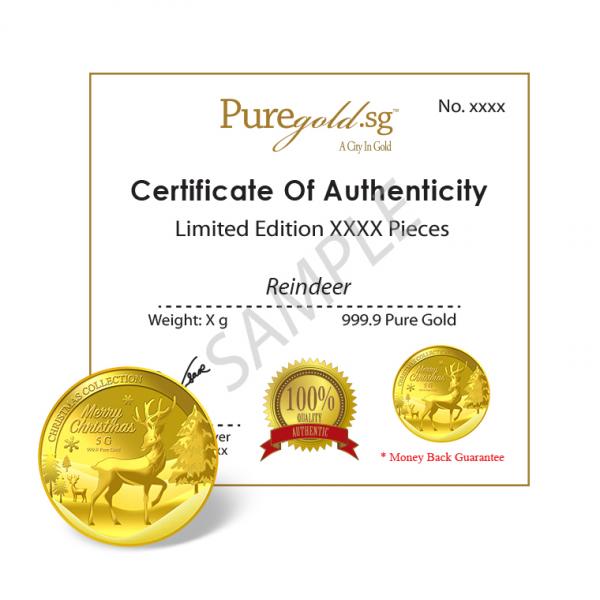 The image of Reindeer and the Snow is embossed on a 5g 999.9 fine gold Medallion.
