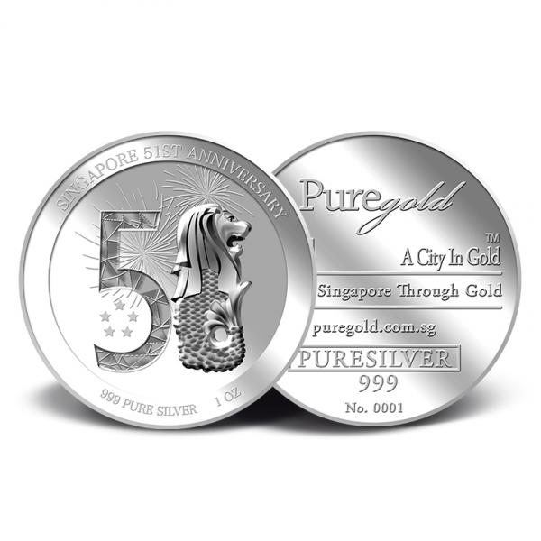 The 1Oz 51st Anniversary Silver Medallion design portrays an image of the 51st year. The design also includes the inscription SINGAPORE 51ST ANNIVERSARY, the medallion’s weight and fineness, and GoldSilver Refinery’s “GS” logo mark.