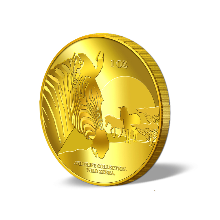 The Zebra gold Medallion design portrays an image of a zebra. The design also includes the inscription WILDLIFE COLLECTION, ZEBRA, the Medallion’s weight and fineness.