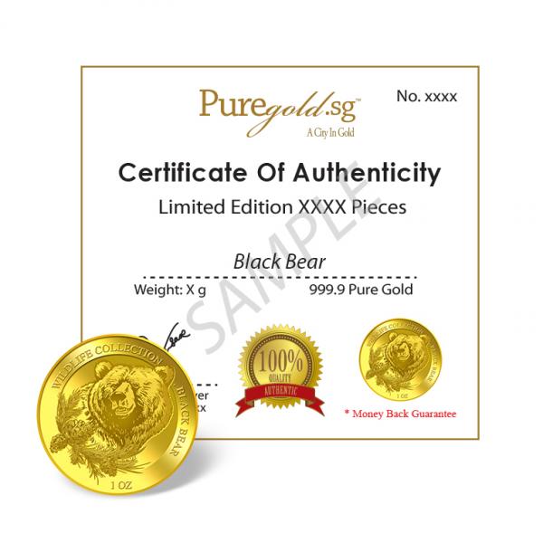 The image of an emerging black bear is embossed on a 1OZ 999.9 fine gold.