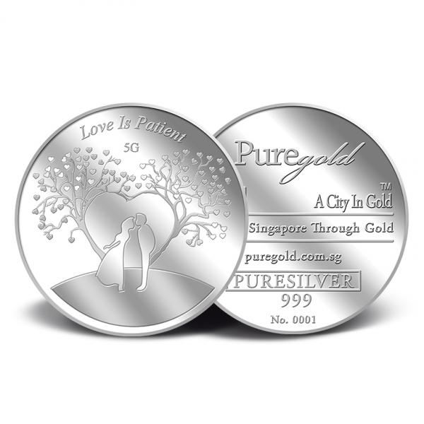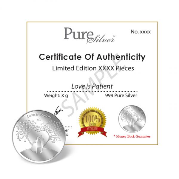 The Love is Patient silver medallion design portrays a beautiful image a groom and a bride.