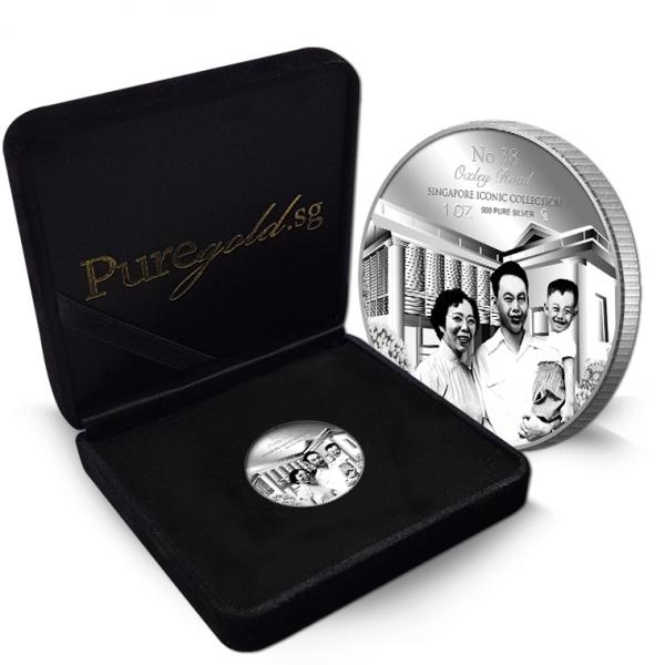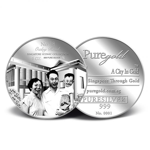 The image of Founding Father with his wife and son, and their house at 38 Oxley Road is embossed on a 1Oz 999 fine silver medallion.