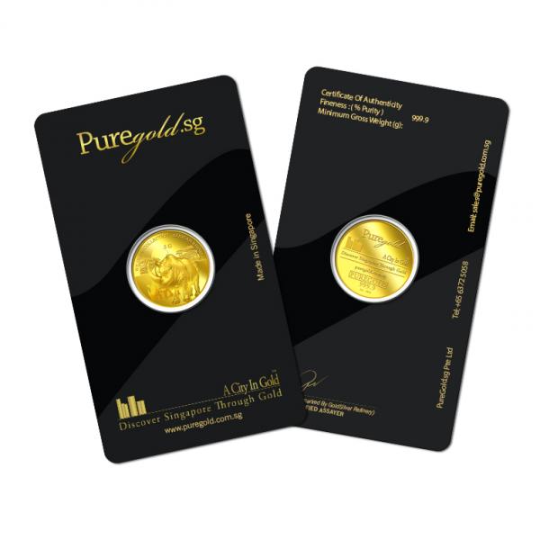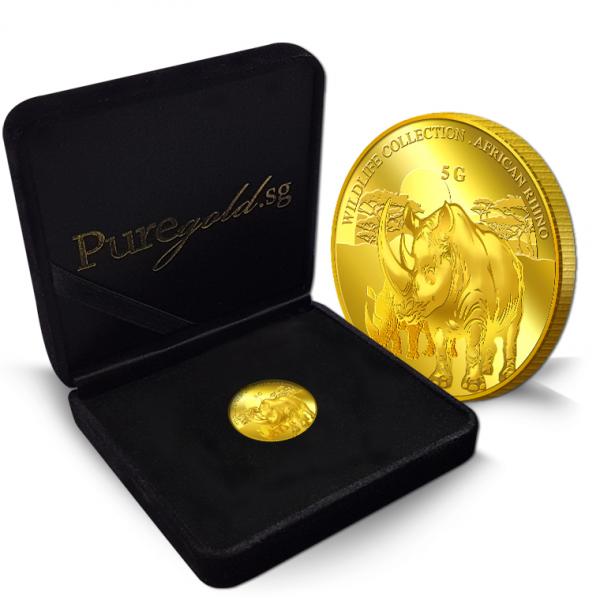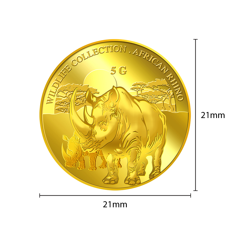 The image of a Rhinoceros is embossed on a 5g 999.9 fine gold.