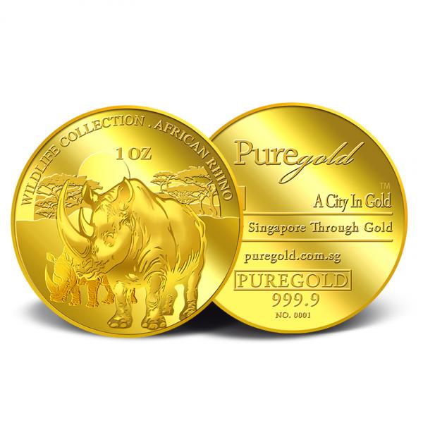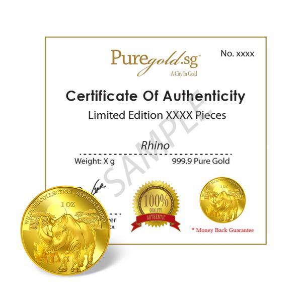 The image of a Rhinoceros is embossed on a 1oz 999.9 fine gold.