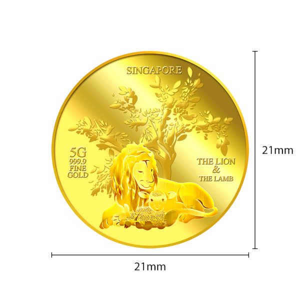 The images of The Lion & The Lamb are embossed on a 5g 999.9 fine gold medallion.