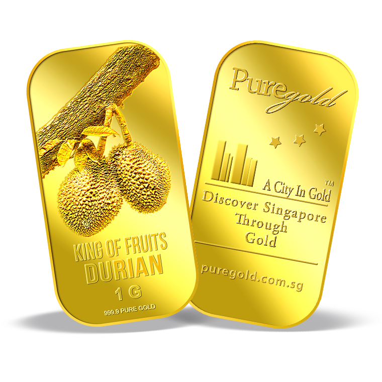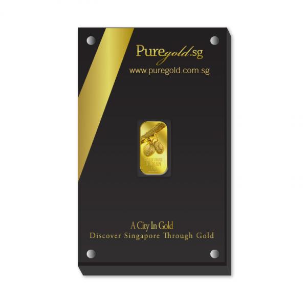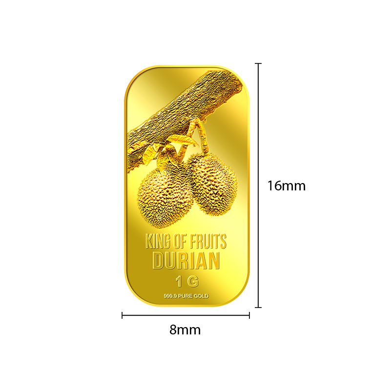 The image of the Durian is embossed on a 1g 999.9 fine gold bar.