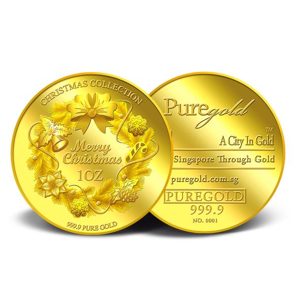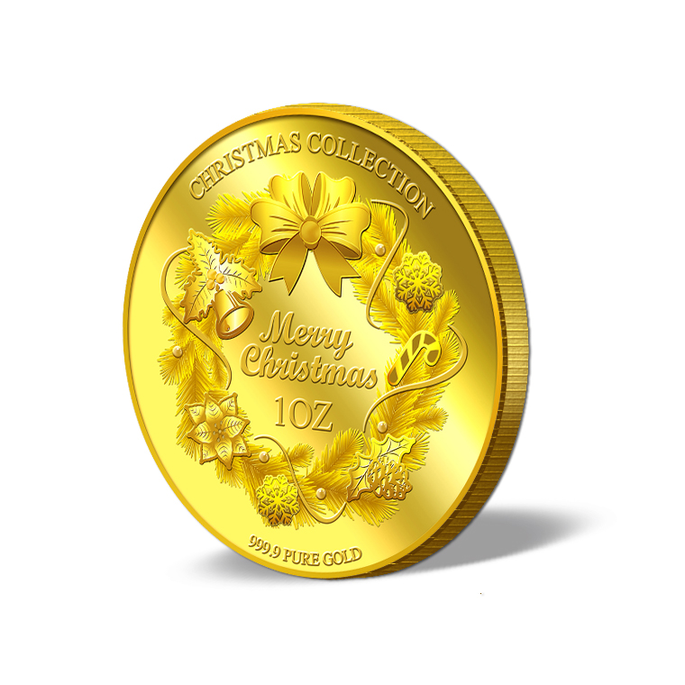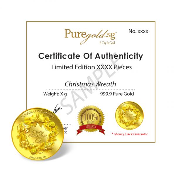 The image of Christmas Wreath is embossed on a 1oz 999.9 fine gold Medallion.