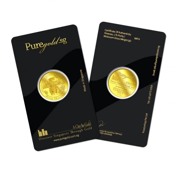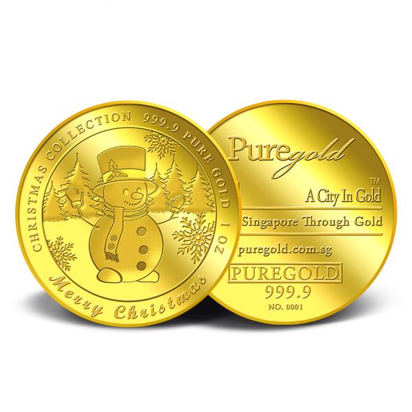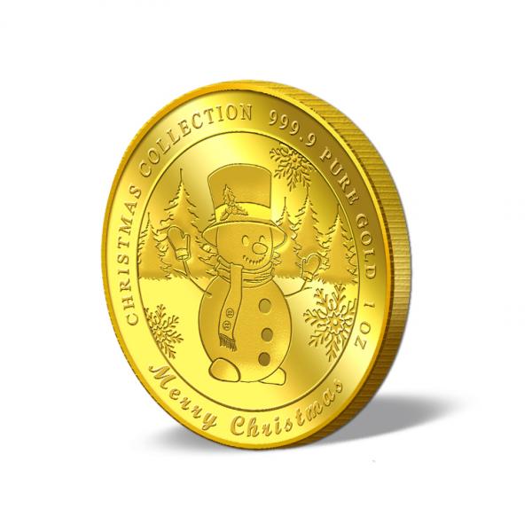 The image of Snowman is embossed on a 1oz 999.9 fine gold Medallion.