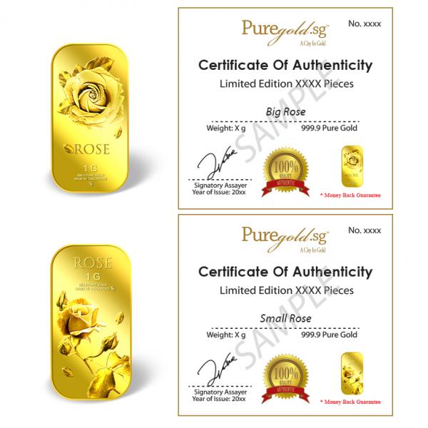 In this uniquely designed gold bar, the big single gold rose with leaves represents joy, gladness, friendship and hope, making this gold bar a perfect gift for loved ones or close friends to show them that we rejoice in their happiness.