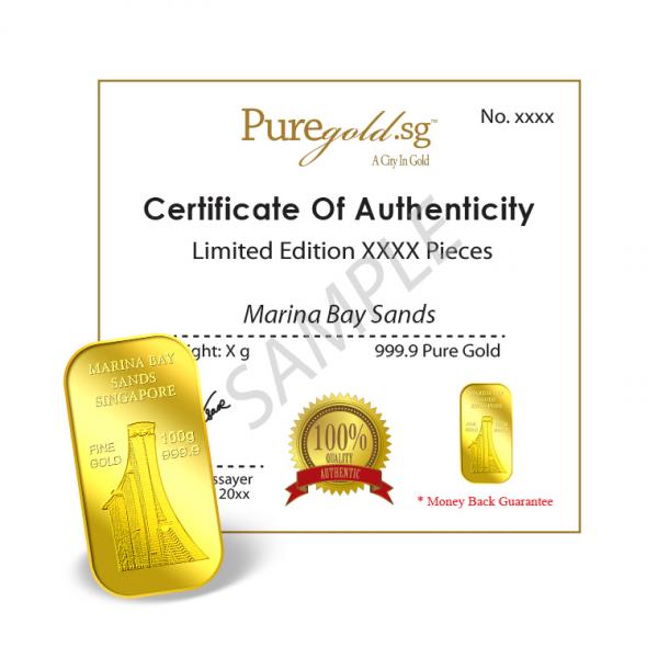 The images of Marina Bay Sands Singapore are embossed on a 100g 999.9 fine gold bar.