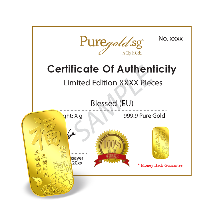 The image is embossed on a 2 grams 999.9 fine gold bar.