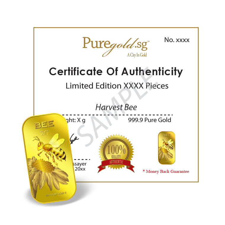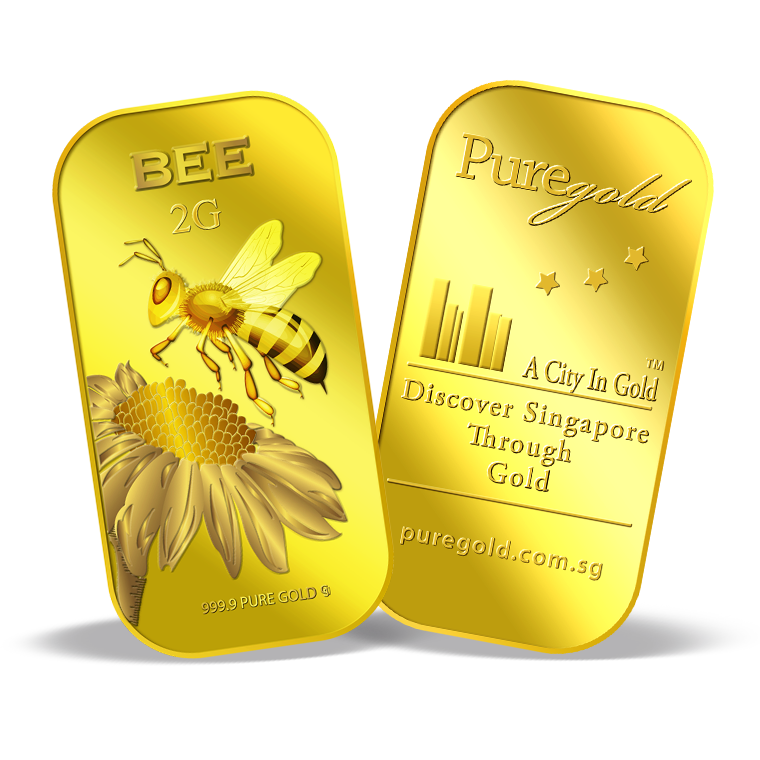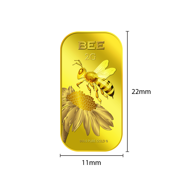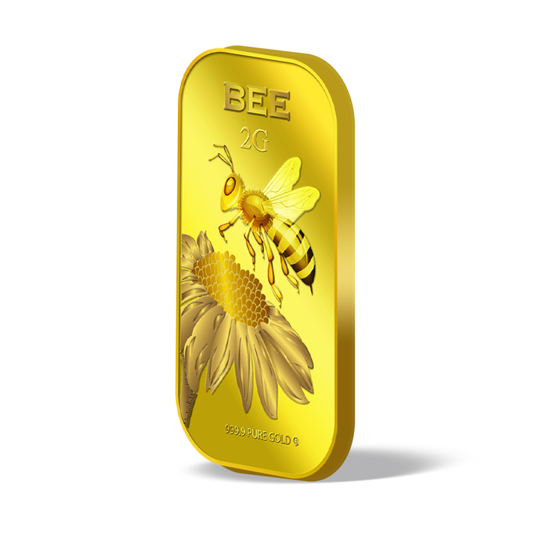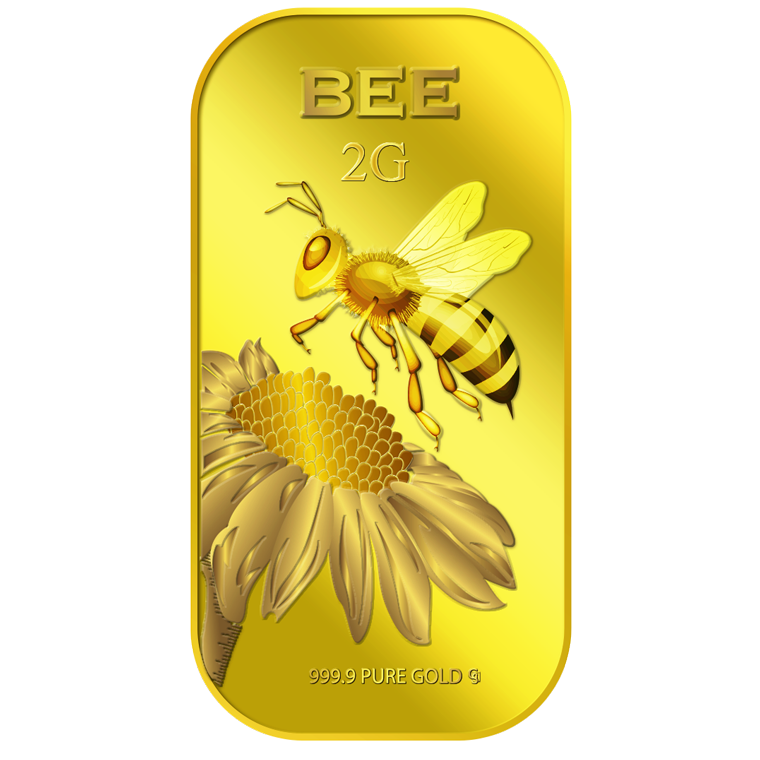 The image is embossed on a 2 grams 999.9 fine gold bar.