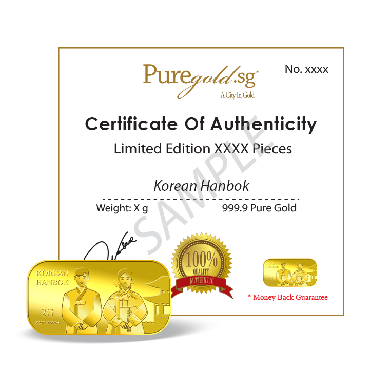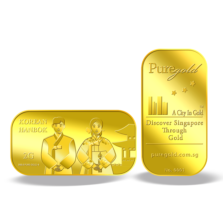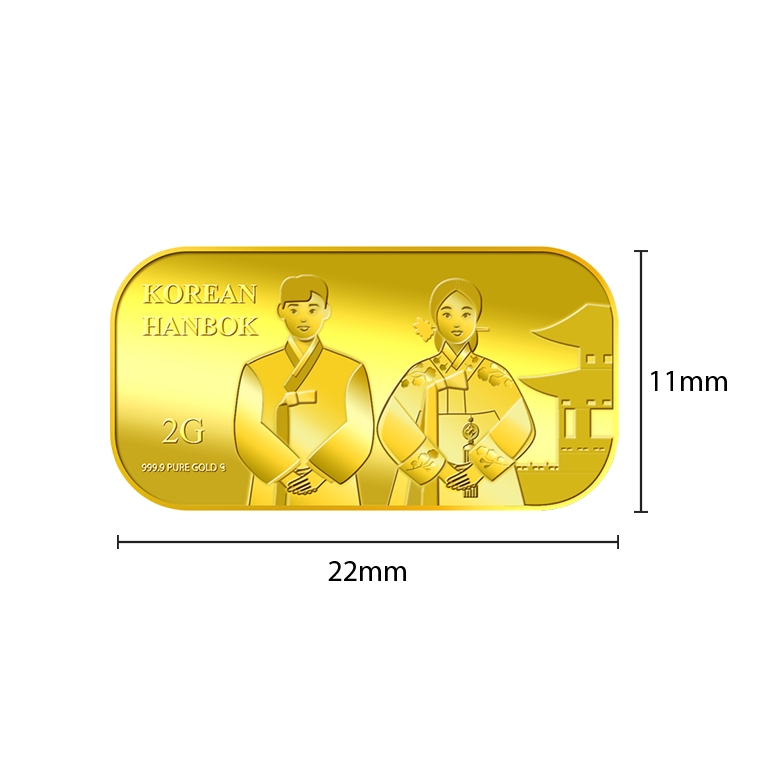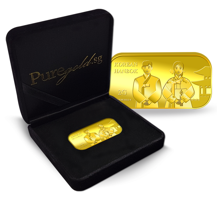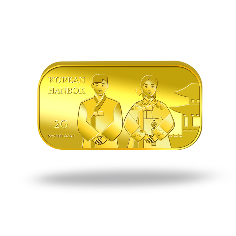 The image is embossed on a 2 grams 999.9 fine gold bar.