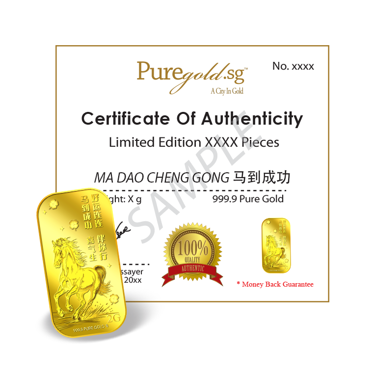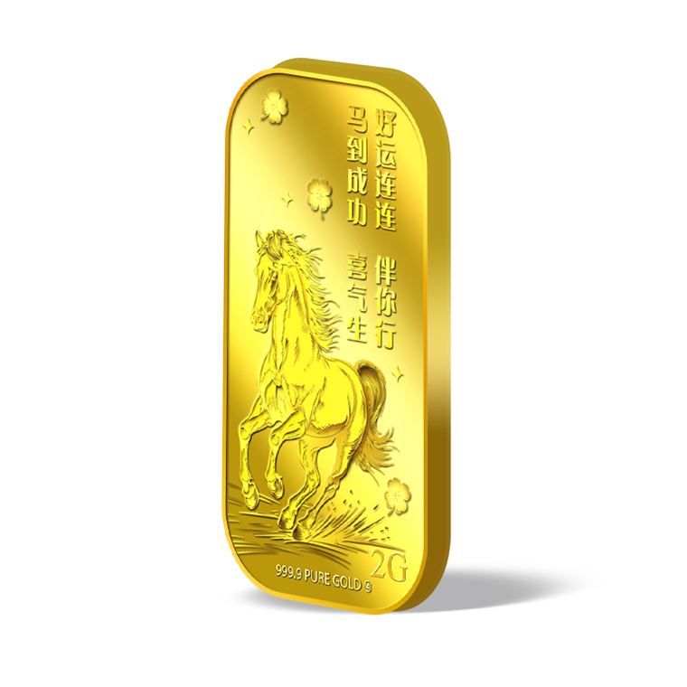 The image is embossed on a 2 grams 999.9 fine gold bar.